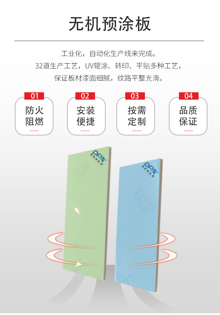 除快速翻新外,无机预涂板具备耐磨、抗冲击、易清洁等优势,降低长期维护成本;丰富的色彩与纹理饰面满足高端审美需求,同时以A1级防火和防潮防霉性能,为空间安全保驾护航。