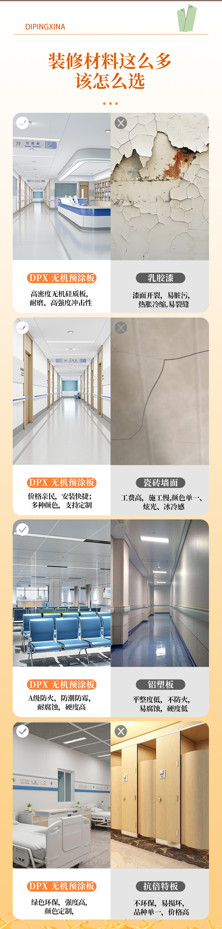 长效美观与便捷维护,进一步巩固了无机预涂板的美观优势。无机预涂板表面涂层硬度高,抗刮擦、抗冲击性能优异,运维人员日常巡检时的轻微碰撞、擦拭不会留下明显痕迹;同时涂层具备良好的耐候性与抗老化性,长期暴露在灯光、潮湿环境下也不易褪色、泛黄,能长期保持墙面洁净美观。此外,其表面光滑易清洁,若沾染油污、灰尘,仅需用湿布蘸取中性清洁剂擦拭即可恢复洁净,无需像乳胶漆那样定期重新涂刷,也无需像瓷砖那样逐一清理缝隙,大幅降低了后期维护的人力与时间成本,确保室内空间长期保持整洁美观的状态。