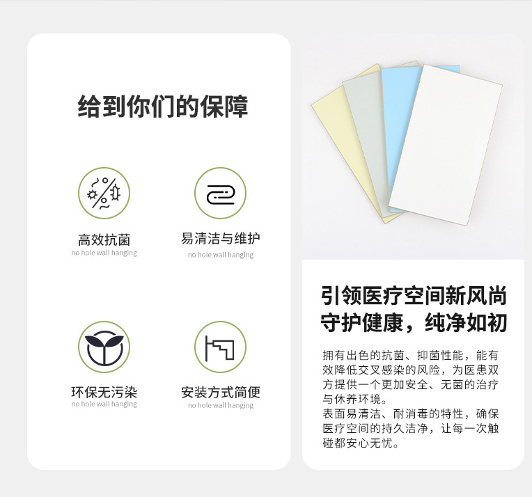 在康养产业高质量发展的当下,康养医院的空间建设已从 “满足基本功能” 向 “安全、健康、舒适、美观” 的综合需求升级。无机预涂板以其A 级防火、抗菌洁净、环保无醛、耐撞耐磨、美观易装的优势,破解康养医院墙面选材的多重痛点,既筑牢安全与健康的底线,又打造温馨疗愈的空间美学,实现环境安全与美观的双赢。未来,随着康养行业的不断发展,无机预涂板将凭借其良好性能,成为更多康养医院的优选墙面解决方案,助力构建更安全、更健康、更美好的康养空间。